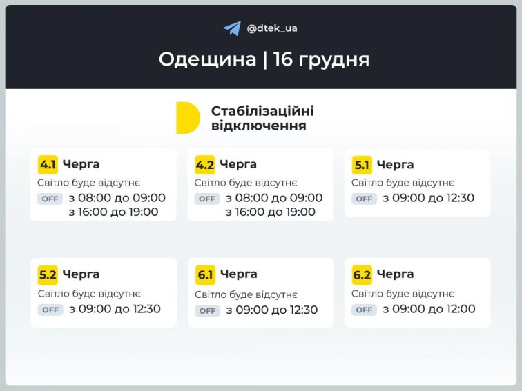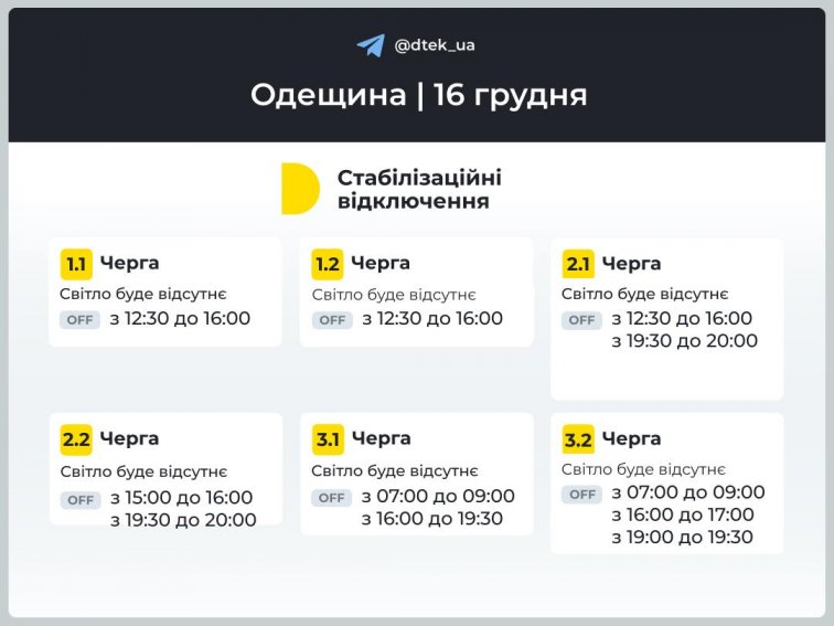 В понедельник, 16 декабря, в Одессе начнут действовать новые унифицированные графики отключения света с 07:00 до 20:00. Электроснабжение будет прекращаться по часам, однако время ограничений может изменяться в течение дня в зависимости от ситуации в энергосистеме.