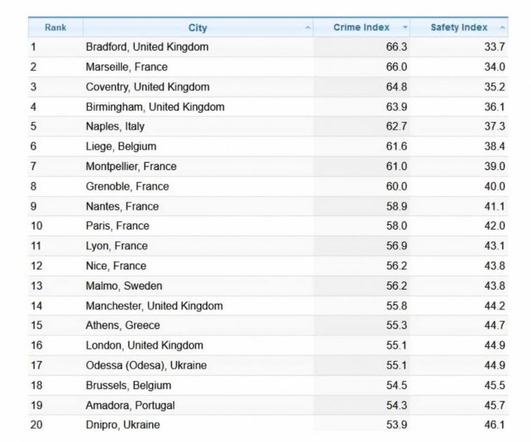 Одесса вошла в число 20 самых опасных городов Европы согласно обновлённому рейтингу международной платформы Numbeo. Несмотря на регулярные ракетные обстрелы со стороны российской армии, город занял 17-ю позицию, оказавшись в одном списке с Лондоном, Парижем, Ниццей и другими мегаполисами. Первое место в антирейтинге досталось британскому Брэдфорду, за которым следуют Марсель (Франция), Ковентри и Бирмингем (Великобритания). Десятку замыкают Неаполь (Италия), Льеж (Бельгия), а также французские города Монпелье, Гренобль, Нант и Париж. Украинский Днепр расположился на 20-й строчке. При этом самыми безопасными признаны Гаага (Нидерланды), Мюнхен (Германия) и норвежский Тронхейм.