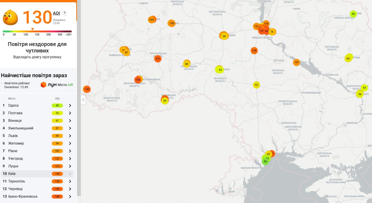 Индекс чистоты атмосферы (AQI) в Одессе составляет 63 единицы, в то время как в Полтаве этот показатель равен 61. Винница имеет индекс AQI 87. Самый загрязненный воздух, согласно исследованию, зафиксирован в столице Украины, Киеве, где средний показатель достигает 164 единицы.