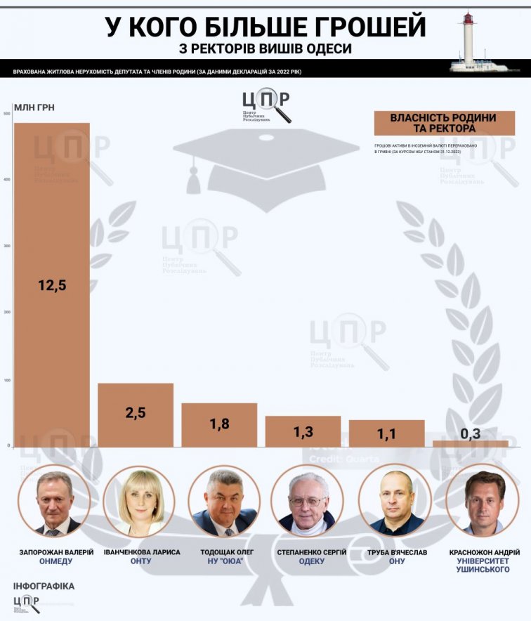 Руководители десяти наиболее рейтинговых вузов Одессы, вошедших в ТОП-10 образовательного рейтинга портала Освіта.uа, задекларировали за 2024 год внушительные доходы, сбережения, объекты недвижимости и земельные участки. Соответствующие данные были проанализированы и обнародованы Центром публичных расследований.