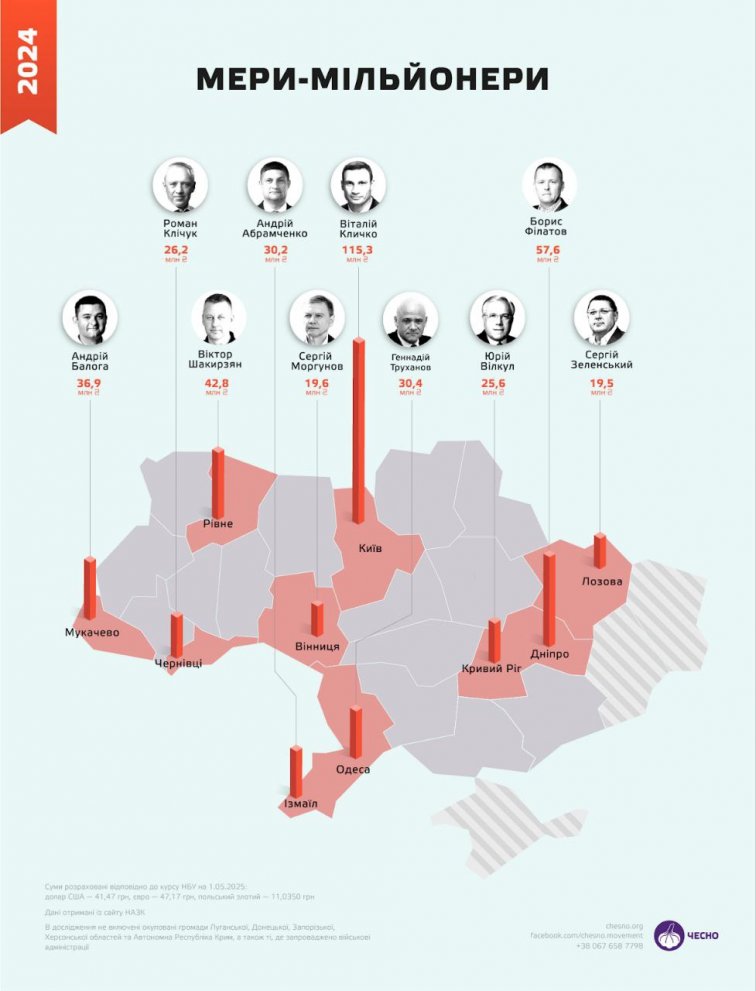 Общий доход 53 мэров крупных городов Украины, по данным ЧЕСНО, составил в 2024 году более 204 миллионов гривен. При этом только около 48,6 миллионов гривен приходится на официальные зарплаты. Остальная часть доходов сформирована за счет бизнеса, недвижимости, дивидендов и других источников.