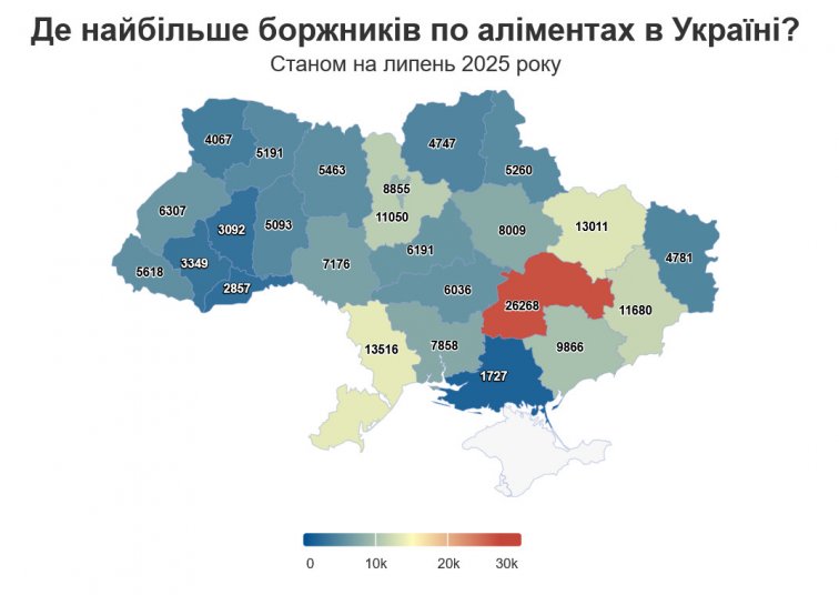 Одной из лидирующих по количеству неплательщиков стала Одесская область, где зарегистрировано 13 516 производств. По этому показателю регион уступает только Днепропетровской области, которая занимает первую строчку антирейтинга. Также в тройку попала Харьковская область, где зафиксирован резкий рост числа алиментных дел.