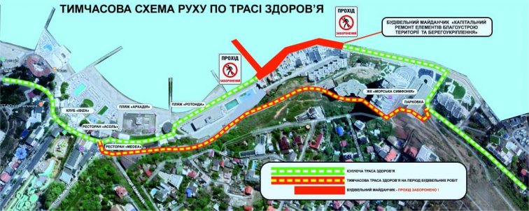 На время проведения строительных работ будет временно ограничено движение пешеходов и велосипедистов по Трассе здоровья на участке от траверса № 2 до жилого комплекса «Морская Симфония». Для удобства горожан и гостей города будет установлена соответствующая дорожная навигация. Движение перенаправят по альтернативному маршруту: от Аркадийской аллеи по верхнему ярусу набережной, далее через придомовую территорию ЖК «Морская Симфония» с последующим выходом обратно на Трассу здоровья.