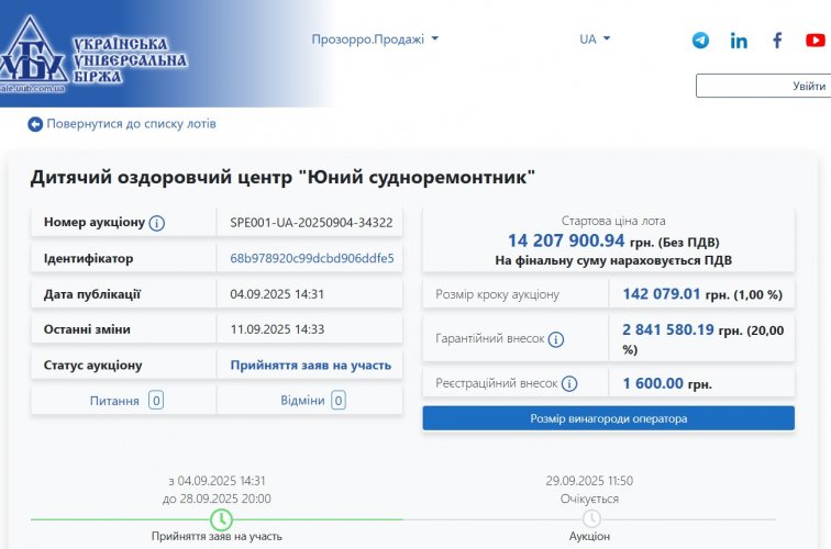 Стартовая цена имущественного комплекса составляет 14 207 901 гривну. Торги запланированы на 29 сентября. По условиям приватизации, новый собственник обязан будет сохранить профиль деятельности оздоровительного центра и обеспечить его дальнейшее функционирование.