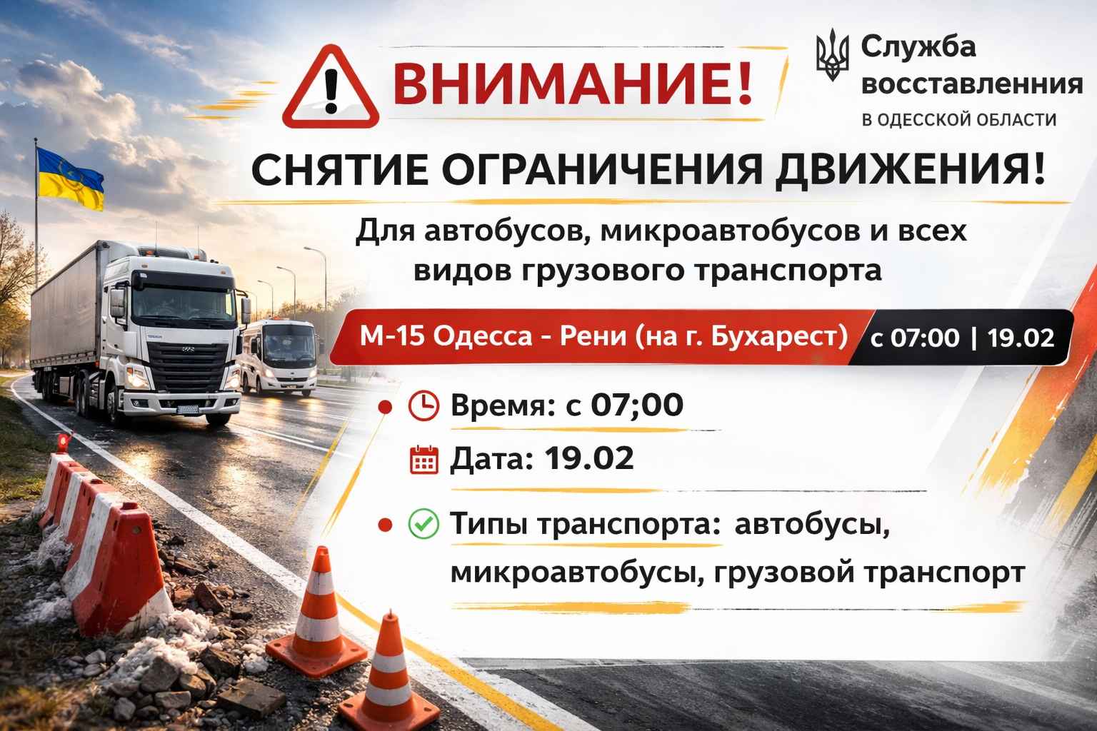 18 февраля с 05:00 на всей протяженности трассы М-15 Одесса-Рени будет введено временное ограничение движения для грузового транспорта, автобусов и микроавтобусов.