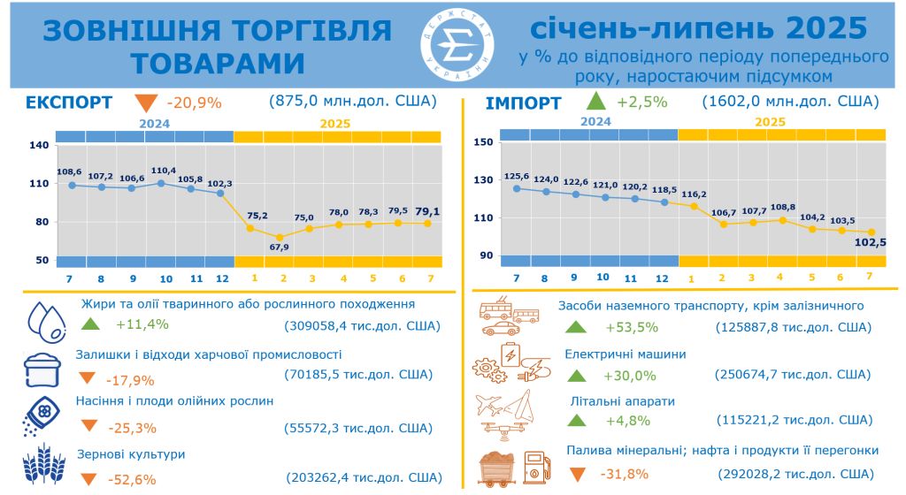 За январь–июль 2025 года предприятия Одесской области вели торговлю более чем со 160 странами мира. По данным Главного управления статистики в регионе, общий объем экспорта составил около 875 млн долларов США. Этот показатель на 20% меньше, чем за аналогичный период прошлого года.