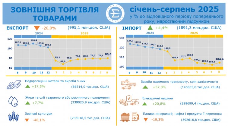 За первые восемь месяцев 2025 года предприятия Одесской области активно осуществляли внешнеторговую деятельность, поддерживая связи с 161 страной мира. По данным Главного управления статистики в Одесской области, объем экспорта составил 995,1 млн долларов США, а импорт достиг 1 891,3 млн долларов. Таким образом, регион продемонстрировал отрицательное торговое сальдо в размере 896,2 млн долларов.