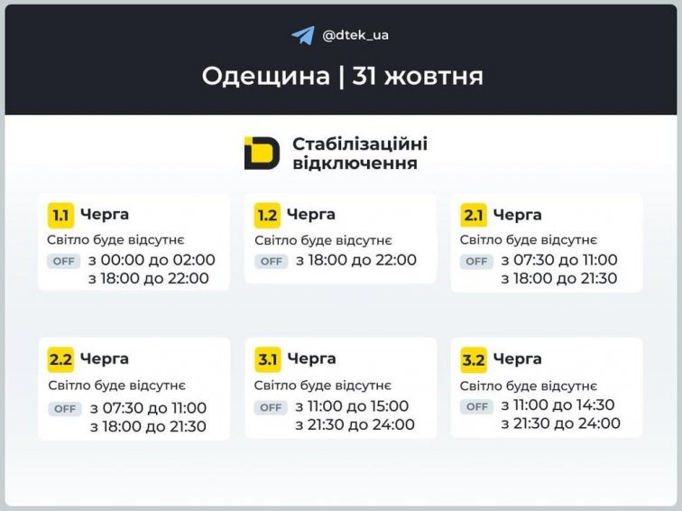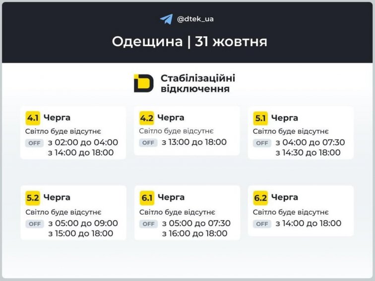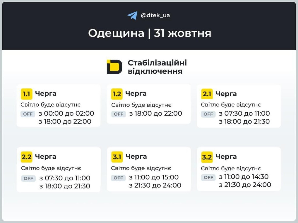 Для жителей региона 31 октября отключения электроэнергии будут проводиться в соответствии с утверждёнными графиками, опубликованными на официальных ресурсах «ДТЭК Одесские электросети». Гражданам рекомендуют заранее ознакомиться с расписанием, чтобы спланировать своё время и минимизировать неудобства.