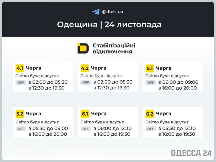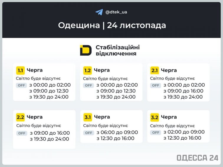 В Одессе и области 24 ноября вновь начнут действовать почасовые отключения электроэнергии. Ограничения будут вводиться одновременно для нескольких групп потребителей. Как сообщили на официальном сайте «Укрэнерго», меры связаны с необходимостью стабилизировать энергосистему и равномерно распределить нагрузку в течение суток.