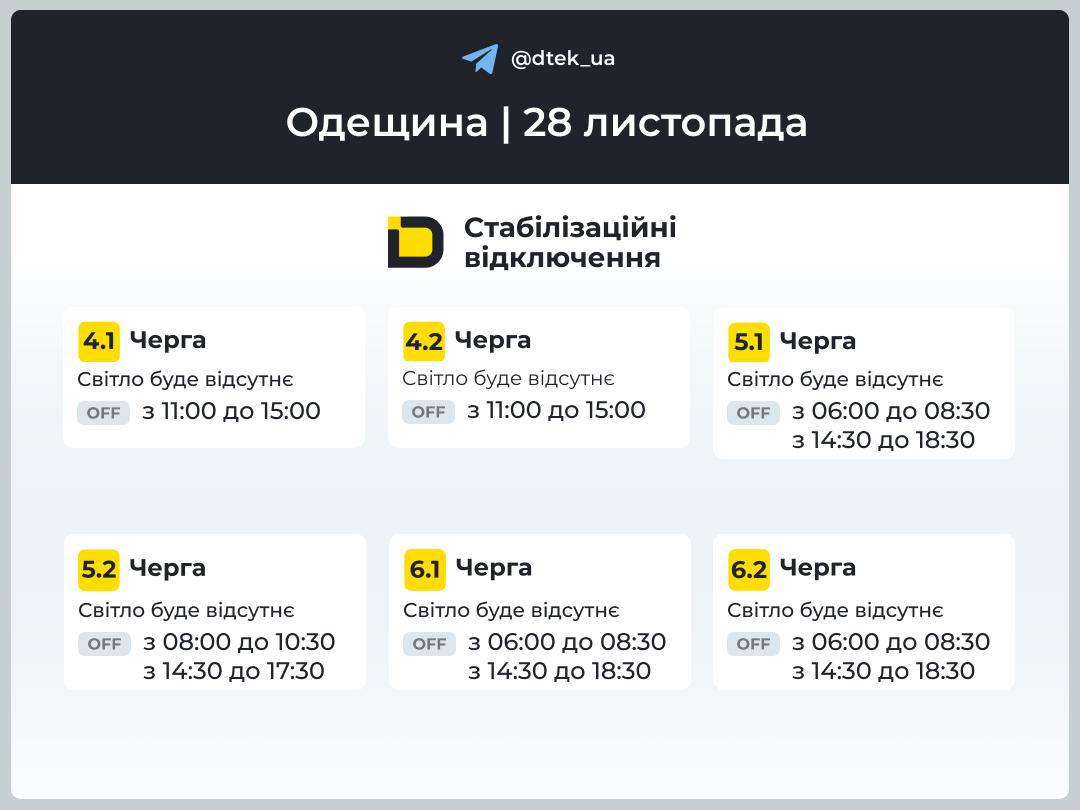 Компания ДТЭК опубликовала обновленные почасовые графики отключений электроэнергии для Одессы и области на 28 ноября. Об этом сообщили в пресс-службе предприятия, уточнив, что данные предоставлены согласно информации «Укрэнерго».