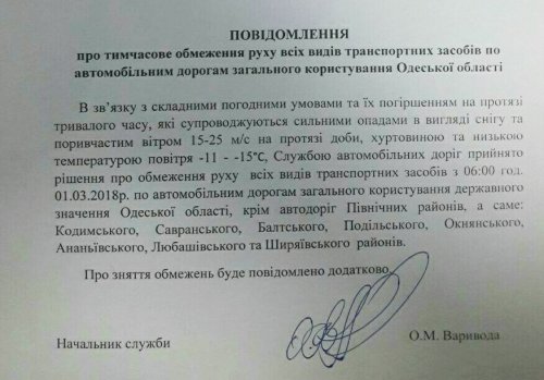 «В связи со сложными погодными условиями и их ухудшением в течение продолжительного времени, которые сопровождаются сильными осадками в виде снега и шквальным ветром 15–25 м/с в течение суток, метелью и низкой температурой воздуха -11–15 градусов, Службой автомобильных дорог принято решение об ограничении движения всех видов транспортных средств (!) с 6:00 01.03.2018 года по автомобильным дорогам общего пользования государственного значения Одесской области», — говорится в сообщении ведомства.