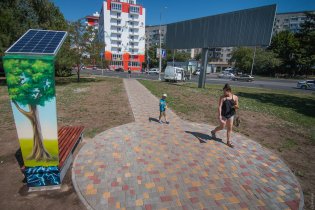 Скамейка, оснащенная солнечной батареей, появилась в сквере на площади Деревянко. На ней можно не только сидеть, но и подзарядить мобильный телефон или ноутбук.