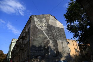 Огромный кот, которого за пять дней нарисовала на стене дома №3 по Бунина американская художница BKFoxx, наконец засиял пятьюдесятью оттенками серого.