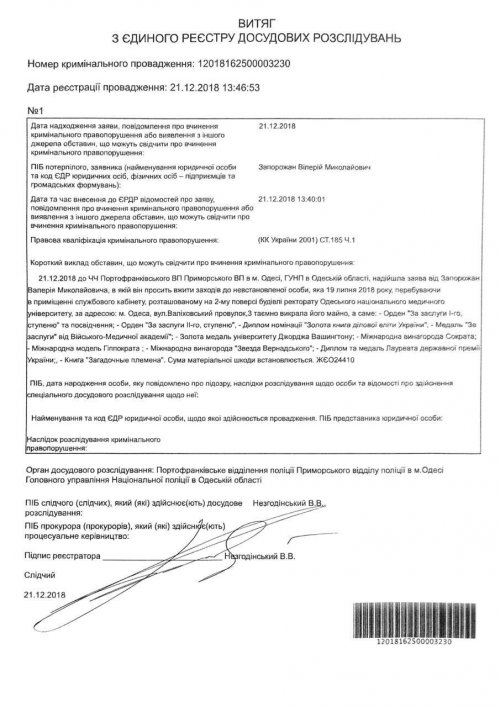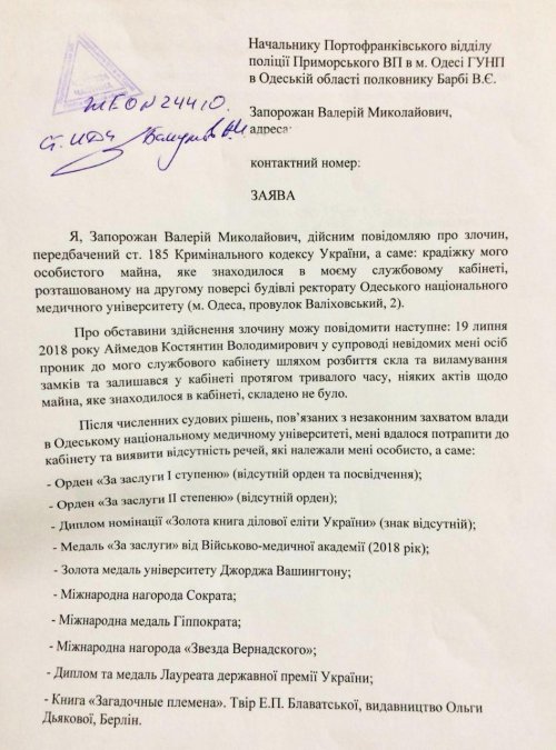 Согласно данным единого реестра досудебных расследований, 19 июля находящиеся в служебном помещении неизвестные похитили из кабинета 9 знаков отличия ректора Валерия Запорожана. Среди них ордена за заслуги I и II степеней, медаль «За заслуги» Военно-медицинской академии, золотая медаль университета Джорджа Вашингтона, дипломы, украинские и международные награды. В настоящий момент устанавливается сумма материального ущерба.