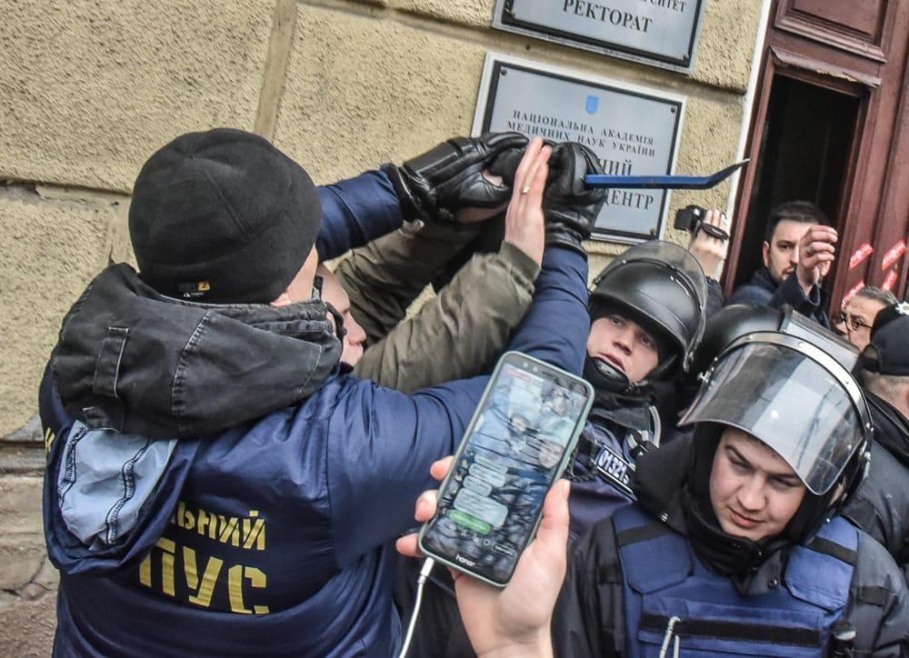 Напомним, сегодня, 20 февраля, здание Одесского медина подверглось очередной рейдерской атаке. Под видом студенческого митинга университет штурмовали около сотни молодых людей спортивной наружности с платками на лицах. На некоторых надеты куртки «Национального корпуса», «Автомайдана», организаций «Дія» и «Національний спротив». На обнародованном в фейсбуке видео видно, как один из таких молодых людей руководит толпой: «Парни, просто стоим». Нападавшие выбили стекла и повредили дверь ректората. На место прибыло несколько десятков сотрудников Нацполиции.