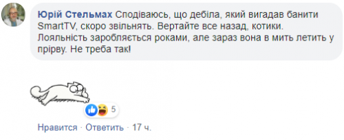 "Надеюсь, что дебила, который придумал банить SmartTV, скоро уволят. Возвращайтесь все назад, котики. Лояльность зарабатывается годами, но сейчас она в момент летит в пропасть. Не надо так!", - пишет Юрий Стельмах.