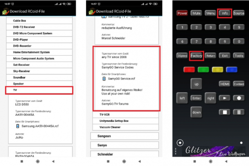 Если данного пульта нет, можно использовать смартфон с ИК портом. Для этого, нужно на телефон установить приложение "RCoid Free" из Play Market. В приложении добавляем пульт (S - Samsung - any TV since 2008). Далее включаем телевизор, с телефона через "RCoid" нажимаем "info" затем "factory" чтобы попасть в расширенное сервисное меню, дальше можно пользоваться обычным пультом, приложение больше не нужно.