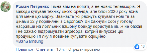 "Говна вам на лопате, а не новых телевизоров. Я всегда покупал технику этого бренда, но блокировка 2020 года убила для меня эту марку. Думаете все рванутся покупать новые тв по завышенным вдвое ценам по сравнению с Европой?", - пишет Роман Петренко.