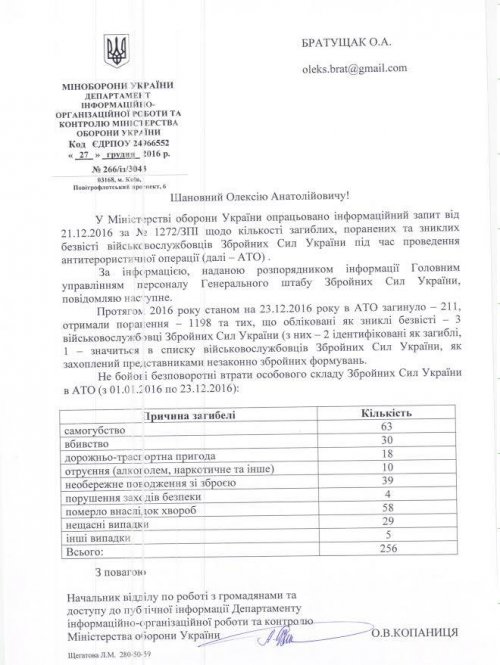 Журналист издания «Украинская правда» Алексей Братущак опубликовал на своей странице в Facebook ответ Министерства обороны Украины на запрос о потерях среди личного состава ВСУ в Донбассе.