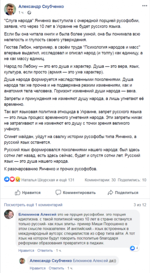 Заявление заместителя главы партии Владимира Зеленского «Слуга народа» Галины Янченко о том, что через десять лет на Украине все забудут русский язык, сделано от недостатка ума и образования.