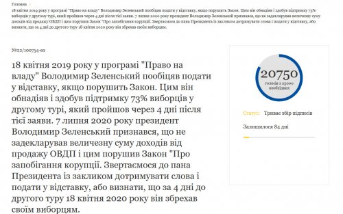 Петиция за отставку президента Украины Владимира Зеленского набрала 20 тысяч 750 голосов из 25 тысяч необходимых за неделю с момента её публикации 8 июля.