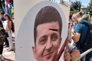 На митинге, организованном партией Порошенко «Европейская солидарность», вывесили фотографию президента Владимира Зеленского с настоящим патроном в голове.