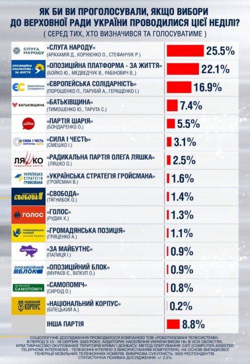 Если бы выборы в Верховную Раду происходили в ближайшее воскресенье, то в парламент бы прошли 5 партий: "Слуга народа" (Д. Арахамия, А. Корниенко, Р. Стефанчук) – 25,5%, "Оппозиционная платформа – За жизнь" (Ю. Бойко, В. Медведчук, В. Рабинович,) – 22,1%, "Европейская солидарность" (П. Порошенко, А. Парубий, И. Геращенко) – 16,9%, ВО "Батькивщина" (Ю. Тимошенко, С. Тарута) – 7,4% и "Партия Шария" (О. Бондаренко). Такие результаты дал социологический опрос, проведенный компанией "Роботизированные телесистемы" с 13 по 16 августа и презентованный в агентстве "Интерфакс-Украина" 18 августа.