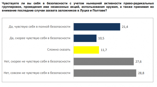 При этом порядка 65% респондентов заявили, что не чувствуют себя в безопасности с учетом нынешней активности праворадикальных группировок, проведения ими незаконных акций, использования оружия, а также принимая во внимание последние случаи захвата заложников в Луцке и Полтаве. Почти 32% заявили, что чувствуют себя в безопасности, и около 12% затруднились с ответом.