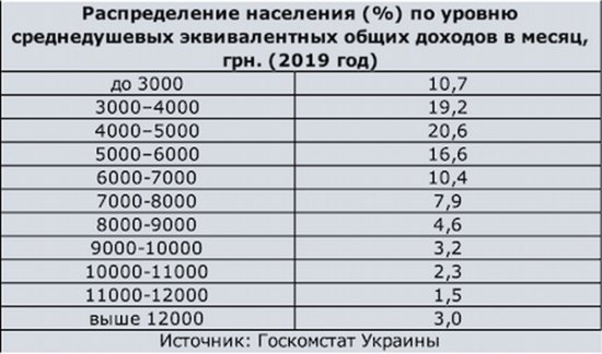 Из этих данных следует, что по итогам прошлого года 50,5% населения Украины может «похвастаться» доходами, которые не превышают 5000 гривен – что теперь соответствует уровню минимальной зарплаты. Для сравнения, в гораздо менее одаренной черноземами и полезными ископаемыми Беларуси аналогичный показатель составляет 31%. Более того, почти 11% населения Украины довольствуется доходами меньше 3000 гривен, а это уже близко к уровню прожиточного минимума. Понятно, что доходы населения включают в себя и пенсии с пособиями, и студенческие стипендии, и они, будучи откровенно мизерными, тянут общий результат вниз. Однако это обстоятельство не сильно меняет печальный расклад, в очередной раз показывая масштаб социальной катастрофы.