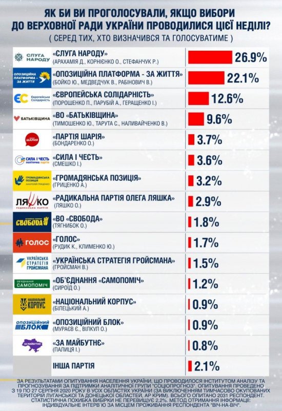 Наибольшее количество мест в новой Раде заняла бы партия "Слуга народа" (Арахамия Д., Корниенко А., Стефанчук Р.) - 26,9%, "Оппозиционная платформа – За жизнь" (Бойко Ю., Медведчук В., Рабинович В.) – 22,1%, "Европейская солидарность" (Порошенко П., Парубий А., Геращенко И.) – 12,6%, и "Батькивщина" (Тимошенко Ю., Тарута С., Наливайченко В.) – 9,6%.
