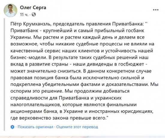 Это манипуляция. Ключевое другое - суд без рассмотрения дела по существу взыскал миллиарды гривен из государственного банка. Без установления того, действительно ли эти средства ПриватБанк должен, без установления каких-либо фактов по делу»,