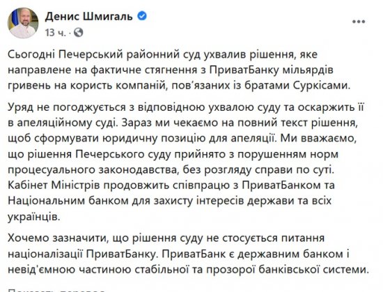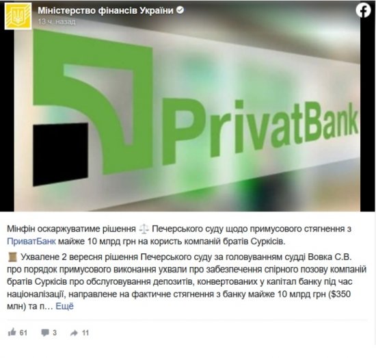 В Министерстве финансов, возмутившись решением суда, заявили, что ведомство не принимает решение суда и, продолжая защищать интересы государства и «ПриватБанка», готовит апеляцию.