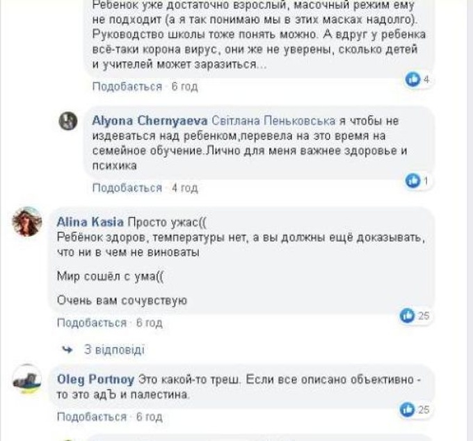 Ученик 8-го класса гимназии №33 в Полтаве из-за аллергии не мог носить медицинскую маску и пользоваться антисептиком: у него начинались приступы удушья. Не разобравшись, школьная медсестра поставила подростку диагноз коронавирусная инфекция COVID-19. После этого в школе началась травля ребёнка, как учителями, так и сверстниками.