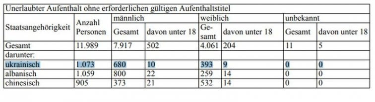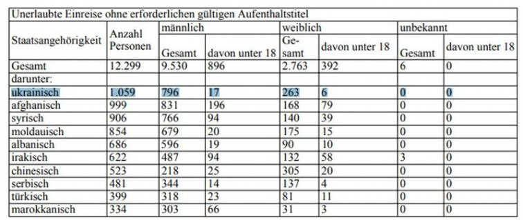 По запросу парламентской фракции «Зеленые» правительство Германии обнародовало статистические данные на тему миграции по состоянию на конец июня текущего года из которых следует, что украинцы стали самыми злостными нарушителями пограничного режима ФРГ, а также законодательства, регулирующего пребывание в этой стране.