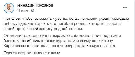 От имени всех одесситов выражаю соболезнования родным и близким погибших, а также курсантам и всему коллективу Харьковского национального университета Воздушных сил.