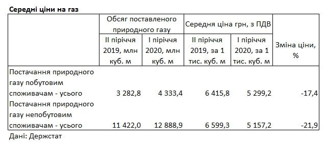 Средняя цена природного газа для бытовых потребителей в первом полугодии 2020 года составила 5 299,2 грн (с НДС) за 1 тыс. куб. м. Этом на 17,4% меньше, чем во втором полугодии 2019 года (6 415,8 грн).