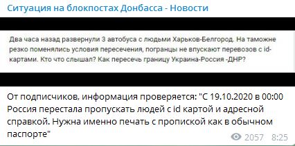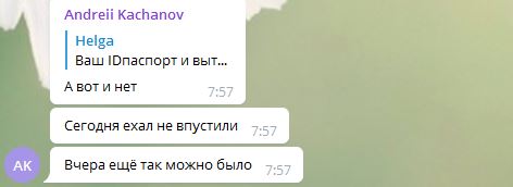 "Два часа назад развернули три автобуса с людьми Харьков-Белгород. На таможне резко поменялись условия пересечения. Погранцы не впускают перевозов (перевозчиков - Ред.) с id-каратами"