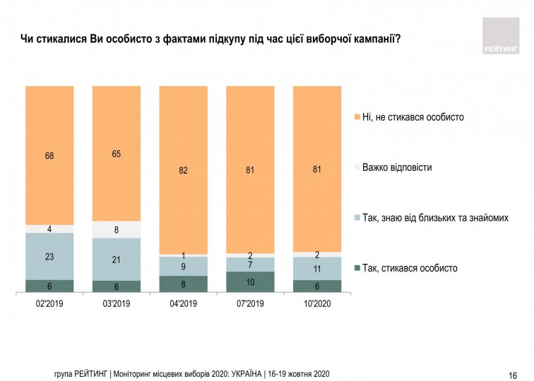 Во время избирательной кампании перед местными выборами, которые пройдут 25 октября, 6% сталкивались с попытками подкупа лично, 11% знают об этом от родственников и знакомых, а большинство (81%) - не имели такого опыта во время этой избирательной кампании.