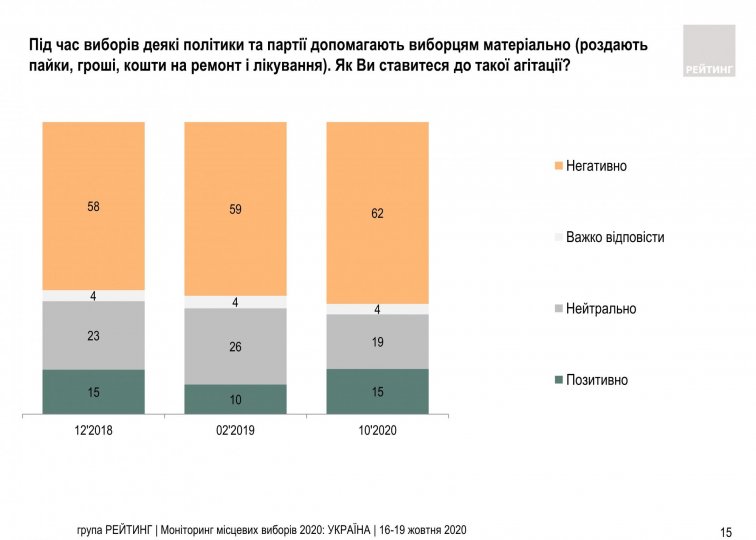 Большинство (62%) украинцев негативно относятся к ситуации, когда во время выборов некоторые политики и партии помогают избирателям материально (раздают пайки, деньги, средства на ремонт и лечение). В то же время 19% респондентов относятся нейтрально, 15% - положительно.
