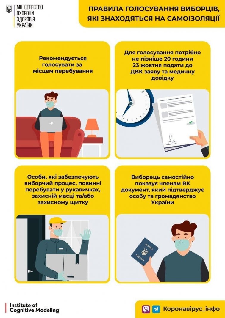 По словам главы Минздрава Максима Степанова, проголосовать могут также те украинцы, которые находятся на самоизоляции (контактные или те, кто болеет амбулаторно). Для этого нужно подать заявление и медицинскую справку в территориальную избирательную комиссию не позже 20:00 23 октября.