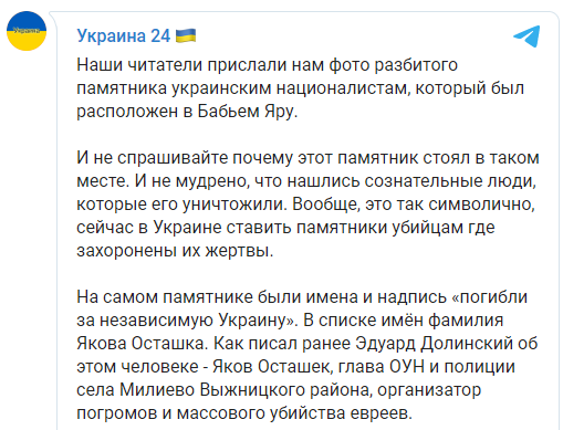 "На самом памятнике были имена и надпись "погибли за независимую Украину". В списке имен фамилия Якова Осташека. Как писал ранее Эдуард Долинский (директор "Украинского еврейского комитета" - Ред.), Яков Осташек - это глава ОУН и полиции села Милиево Выжницкого района, организатор погромов и массового убийства евреев.