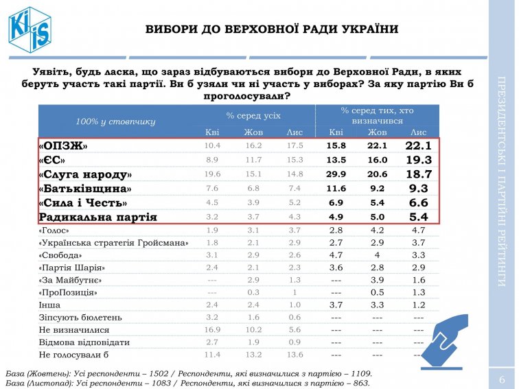 Если бы парламентские выборы проходили в начале ноября 2020 года, в парламент попали бы шесть партий. Самые высокие шансы преодолеть 5%-й барьер имеют "Оппозиционная платформа - За жизнь", "Европейская солидарность", "Слуга народа", "Батькивщина", "Сила и честь" и Радикальная партия.