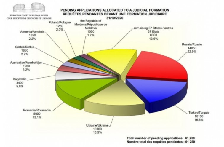 Так, по состоянию на конец октября 2020 года, на рассмотрении в суде находилось 10 100 жалоб, ответчиком в которых указана Украина.