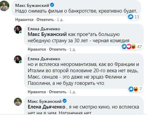 В комментариях к записи депутат Верховной рады от правящей партии «Слуга народа» Максим Бужанский иронически предложил снять фильм о банкротстве.
