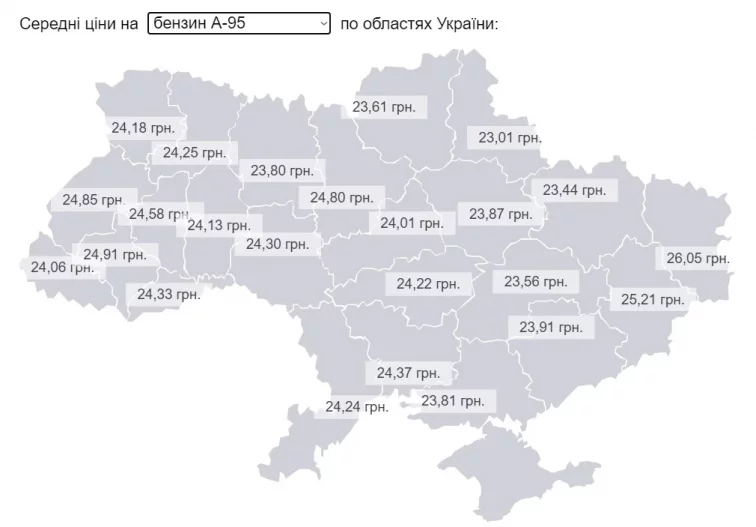 Литр бензина А-95 меньше всего стоил в Сумской области (23,01 грн), а самым дорогим был в Луганской области (26,05 грн).