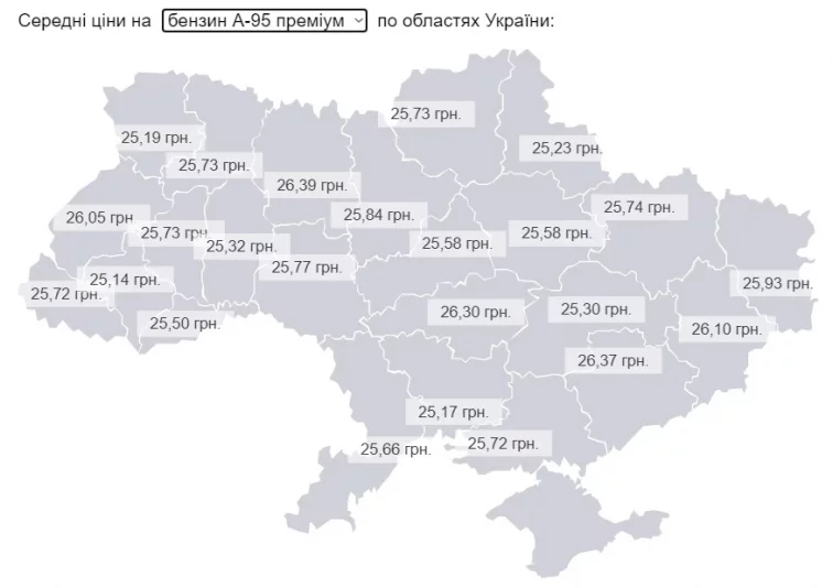 Так, сегодня утром самым дешевым литр бензина А-95 премиум был в Ивано-Франковской области - 25,14 грн, а самым дорогим в Житомирской - 26,39 грн.