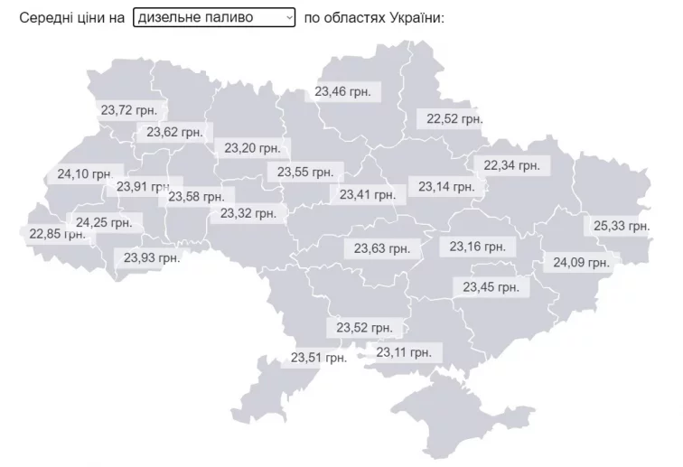 Литр дизтоплива самым дешевым был в Харьковской области (22,34 грн), а самым дорогим - в Луганской (25,33 грн).