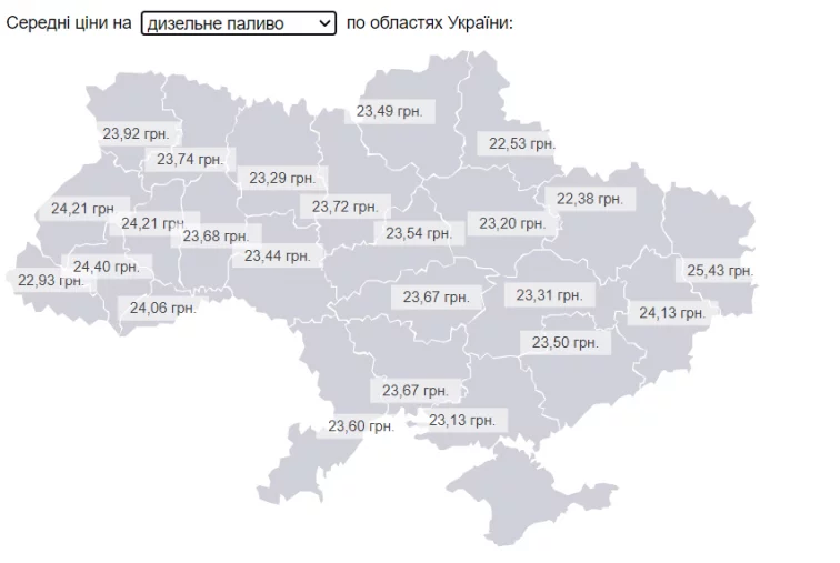 Литр дизтоплива самым дешевым был в Херсонской области (22,13 грн), а самым дорогим – в Луганской (25,33 грн).