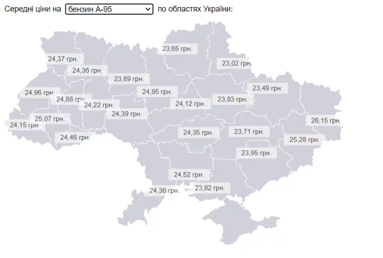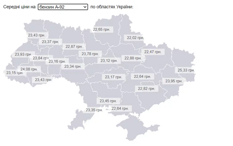 Литр бензина А-92 можно было приобрести от 22,02 грн в Сумской области до 24,08 грн в Ивано-Франковской.