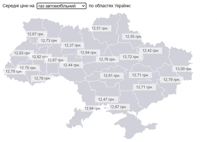 Цена на литр автомобильного газа колебалась от 12,42 грн в Харьковской области до 13,00 грн в Луганской.